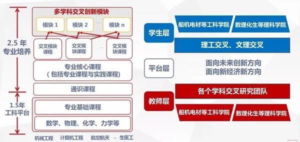 4.交叉融合。在交叉融合方面,學校正在探索多方向的專業(yè)培養(yǎng)模式。在原有單線程專業(yè)培養(yǎng)基礎上,允許學生跨專業(yè)選修一部分課程,在不同專業(yè)間做交叉培養(yǎng)。同時正在建設具有高階性、創(chuàng)新性、挑戰(zhàn)度的交叉榮譽課程,讓人才培養(yǎng)在專業(yè)及課程都能實現(xiàn)跨界交叉。
