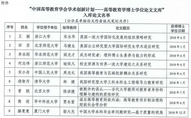 “中國高等教育學會學術(shù)創(chuàng)新計劃——高等教育學博士學位論文文庫”入庫論文名單